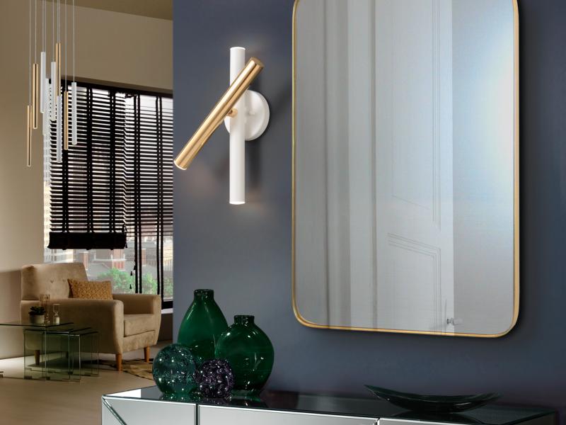 Lámpara de pared de 3 luces LED con brazo giratorio . Realizada en metal acabado oro brillo y blanco mate. Difusor acrílico opal. 15W, 1350 lm, 3.000 K. DIMABLE.