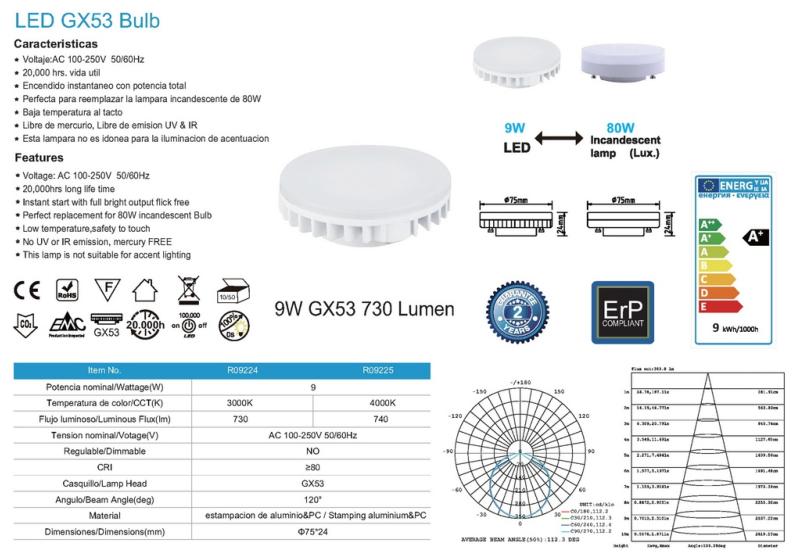 | Caracteristicas | | Materiales / Tonalidad | - Cuerpo | Policarbonato / Aluminio | | - Tonalidad | Blanca | Iluminación | - Datos de Luz | Led | - Potencia: | 9w | - Tonalidad de luz | Disponible en: - 3000k Luz Semicalida - 4000k Luz Neutra | - Lumenes: | - Version 3000k - 730 lumenes - Version 4000k - 740 lumenes | - Angulo apertura de luz | 120º | - Regulable en intensidad: | No | | Medidas | |