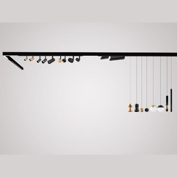 , los carriles pueden instalarse de forma continua, pasando de techo a pared sin interrupciones, creando composiciones únicas y totalmente personalizadas.