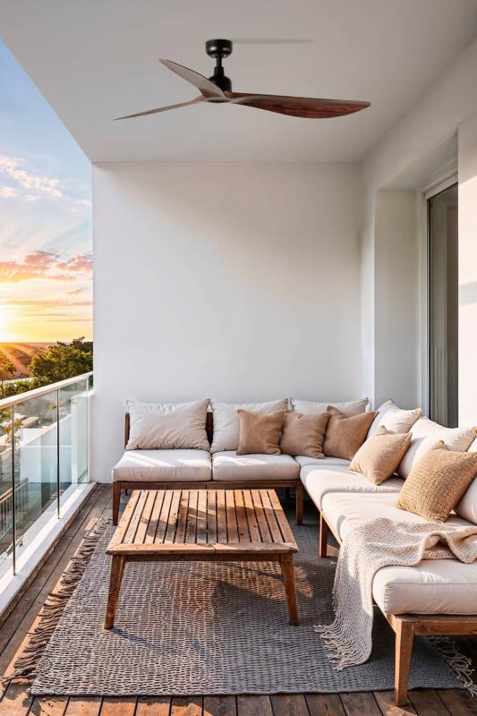 Materiales | - Base Motor: Acero - Aspas: ABS | | Tonalidad de Metal | Marrón oscuro | Accionado mediante | Mando a distancia. | Programador de apagado | Si | Numero de Aspas | 3 | Tonalidad de Aspas | Nogal | Motor Tipo | DC - Bajo Consumo | Velocidades | 6 | Velocidades / Consumo | - 1ª velocidad: 73 rpm - 5w - 2ª velocidad: 92 rpm - 8w - 3ª velocidad: 108 rpm - 12w - 4ª velocidad: 127 rpm - 18w - 5ª velocidad: 141 rpm - 25w - 6ª velocidad: 152 rpm - 35w | | Flujo de Aire | 187 m3 | Función Invierno | Si. Activada en el mando. | Luz | No | Posible montaje sin barra | No | Posible montaje en techo inclinado | Sí* | Grafico de medidas Ventilador Outwood L Faro |
