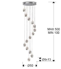 Lámpara Colgante circular Rocío Schuller - Oro 14 L. LED Lámpara de 14 luces LED. Realizada en metal acabado cromo. Tulipas con forma de gota de cristal macizo con burbujas en su interior y base de metal. Altura regulable, máx.500cm. DIMABLE por BLUETOOTH con APP para smartphone.70W LED, 6.720 lm. 3.000K Incluye driver led con dimado por Bluetooth para uso mediante una App de móvil o tablet. También mediante un altavoz inteligente como Google Home o Amazon Echo si se añade un dispositivo Bluetooth Gateway. No es compatible con un regulador de pared. -- MATERIALES -- - Material - Acabado -- ILUMINACION -- - Tipo - Clase Energética - Potencia Máxima - Lúmenes - Temperatura de Luz - Luz Dimable -- MEDIDAS -- Peso Altura minima Altura maxima Diametro | Estructura Metal, Tulipa cristal Oro. LED. Clase 1. 70W. 6.720 Lumenes. 3.000k - Luz Semicálida. Si. 19.8 Kg. 100 cm. 300 cm. 50 cm. |