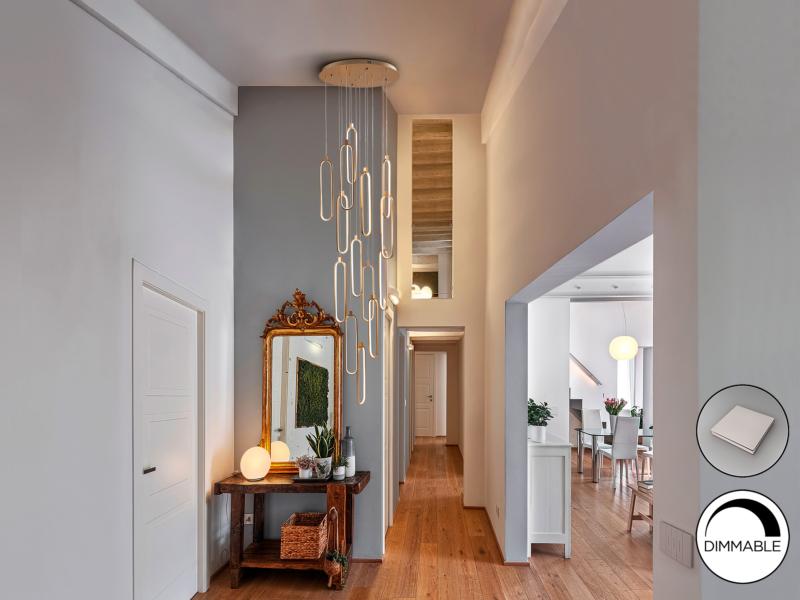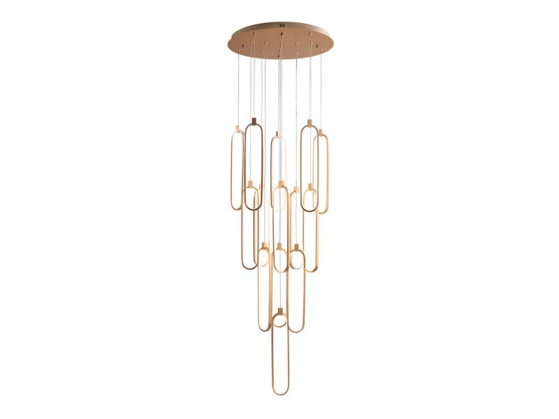 COLETTE-LAMPARA 14L ORO ROSA DIM - SCHULLERLámpara de 14 luces LED, realizada en aluminio cepillado, acabado oro rosa. Difusores de silicona opal. Regulable en altura. 182W LED, 16,380 lm, 3.000 K. DIMABLE, con control remoto y con APP. Material/Tonalidad - Materiales: Aluminio, silicona./Aluminium, - Acabado: Oro rosa, opal/Rose gold, opal Iluminación - Potencia Eléctrica: 182W - Lúmenes: 16380 - Tonalidad de la luz: 3000 K - Regulable mediante: CONTROL RE - Tensión: 110/277 V - Frecuencia: 50/60 Hz - Vida Media: 50000 Horas - CRI: 80 Medidas - Articulo: Diámetro 60 cms / Alto 49 cms - Lámpara instalada: Altura Mínima 115 cms / Altura Máxima 300 cms - Peso: 8,4 Kg - Pantalla/Tulipa: Ancho 10 cms / Alto 49 cms / Fondo 2 cms - Florón de techo: Diámetro 6 cms / Ancho 56 cms / Alto 56 cms Otros Datos de Interés - IP: IP 20 - Código EAN: 8435435339128.0 - Colección: Colette