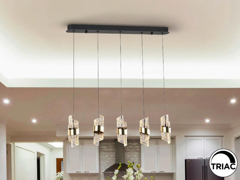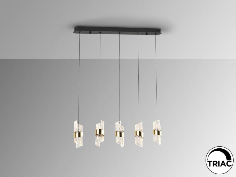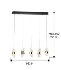 ILIADA-LAMPARA 5L NEGRO-ORO - SCHULLERLámpara de 5 luces LED. Realizada en metal acabado negro mate y oro brillo. Tulipas con diseño en espiral, realizadas en acrílico moldeado y tallado. Regulables en altura. 35W LED.3,200 lm. 3.000 K. DIMABLE. Material/Tonalidad - Materiales: Metal, acrílico./Metal, acryli - Acabado: Negro, oro, transparente./Blac Iluminación - Potencia Eléctrica: 35W - Lúmenes: 3220 - Tonalidad de la luz: 3000 K - Tensión: 180/240 V - Frecuencia: 50/60 Hz - Vida Media: 50000 Horas - CRI: 90 Medidas - Articulo: Ancho 96 cms / Fondo 9 cms / Alto 23 cms - Lámpara instalada: Altura Mínima 35 cms / Altura Máxima 160 cms - Peso: 5,3 Kg - Pantalla/Tulipa: Diámetro 7 cms / Alto 23 cms - Florón de techo: Ancho 94 cms / Alto 5 cms / Fondo 7 cms Otros Datos de Interés - IP: IP 20 - Código EAN: 8435435339029.0 - Colección: Iliada
