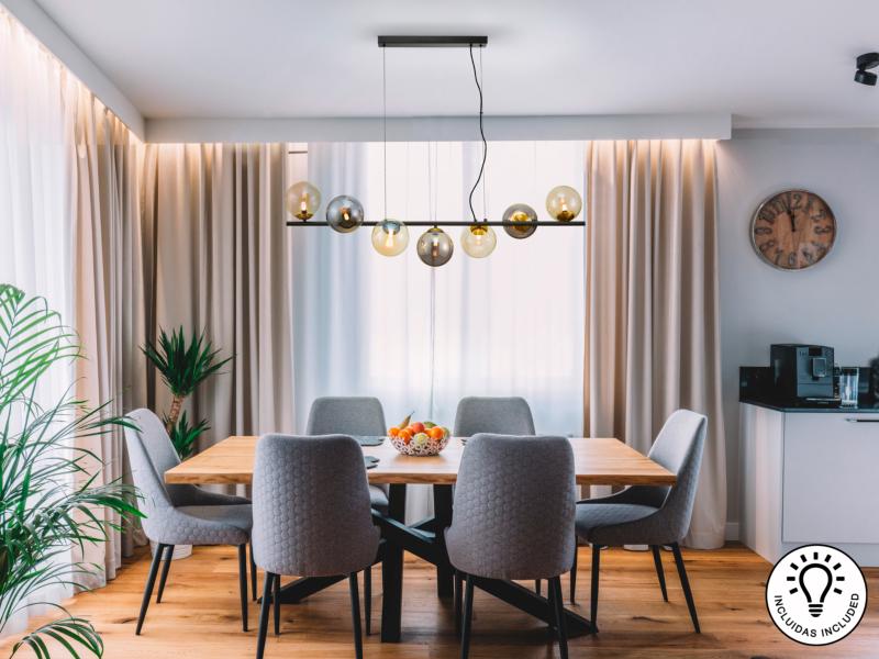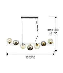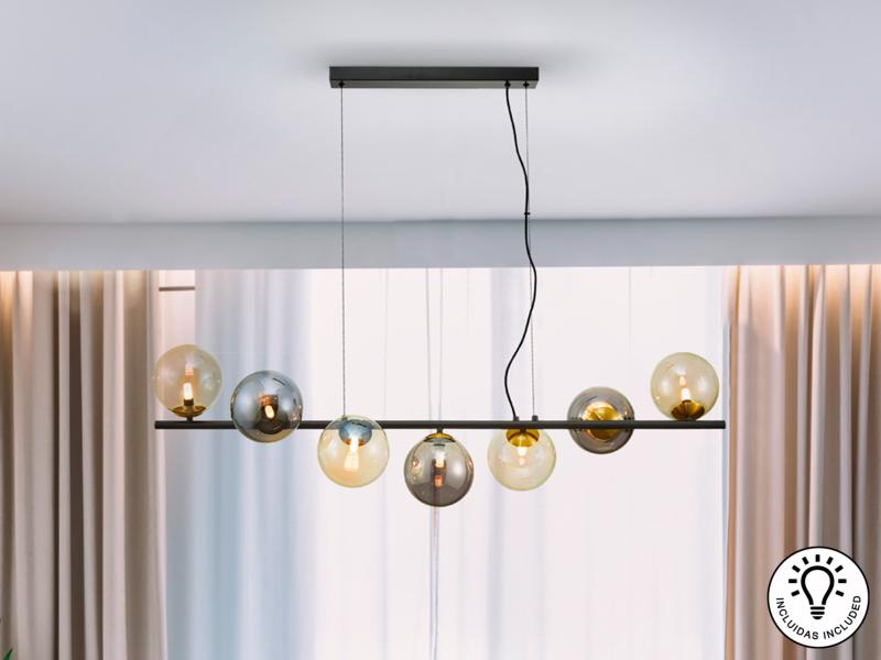 INOA-LAMPARA 7L NEGRO-SMOKE-AMBAR - SCHULLERLámpara realizada en metal, acabado negro mate y laton satinado. Tulipas esféricas de cristal acabados en ambar y gris smoke espejado. Regulable en altura. Material/Tonalidad - Materiales: Metal, cristal/Metal, glass - Acabado: Negro, laton, smoke, ambar./Bl Iluminación - Número de Bombillas: 7 - Tipo de Bombillas: G9 - Bombillas incluidas: Sí - Potencia por Bombilla: 4W - Voltaje de Bombilla/s incluidas: 230 V - Potencia Eléctrica: 7x10W - Lúmenes: 2800 - Lúmenes por Bombilla: 400.0 - Tensión: 220/240 V - Frecuencia: 50/60 Hz - Frecuencia de Bombilla: 50 Hz Medidas - Articulo: Ancho 120 cms / Fondo 34 cms / Alto 34 cms - Lámpara instalada: Altura Mínima 50 cms / Altura Máxima 200 cms - Peso: 2,89 Kg - Pantalla/Tulipa: Diámetro 15 cms / Alto 15 cms - Florón de techo: Ancho 45 cms / Alto 3 cms / Fondo 8 cms Otros Datos de Interés - IP: IP 20 - Código EAN: 8435435339296.0 - Colección: Inoa