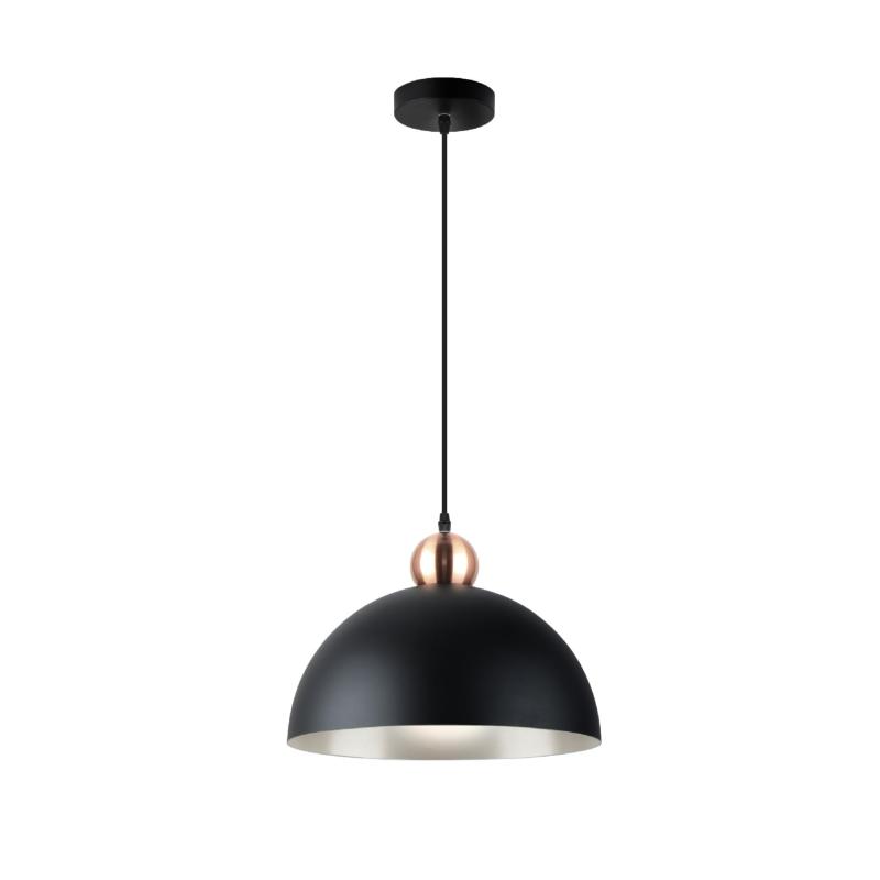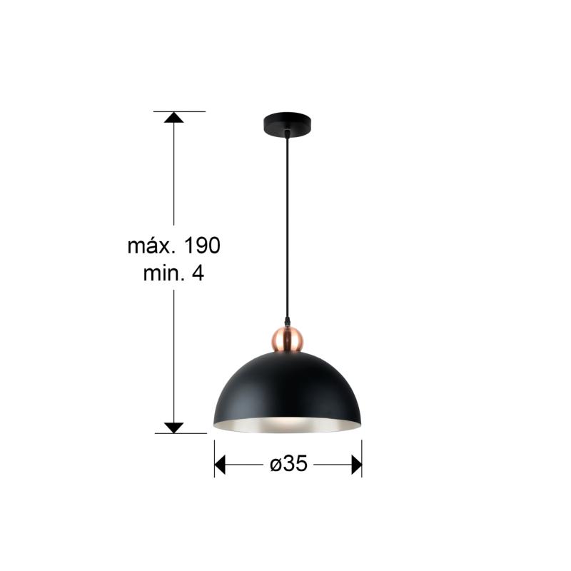 POLO LAMPARA 1L -NEGRO/COBRE - ILUMINACION i3 By SCHULLERLámpara de 1 luz realizada en metal acabado negro mate y cobre. Regulable en altura. 1 E27 Material/Tonalidad - Materiales: Metal./Metal - Acabado: Negro mate, cobre/Black, matt, Iluminación - Potencia Eléctrica: 1x20W - Tensión: 110/220 V - Frecuencia: 50/60 Hz Medidas - Articulo: Diámetro 35 cms / Alto 26 cms - Lámpara instalada: Altura Mínima 40 cms / Altura Máxima 190 cms - Peso: 1,37 Kg - Pantalla/Tulipa: Diámetro 35 cms / Alto 18 cms - Florón de techo: Diámetro 12 cms / Alto 3 cms Otros Datos de Interés - IP: IP 20 - Código EAN: 8435435344948.0 - Colección: Polo