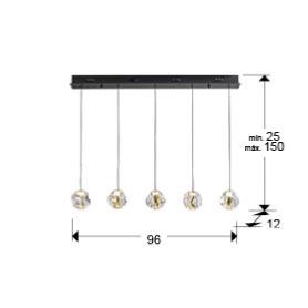 Lampara de 5 luces, realizada en metal acabado negro mate con detalles dorados y tulipas de acrílico transparente. 21W LED, 1339 lm, 3000K. Incluye driver TRIAC y SET DIMADO.