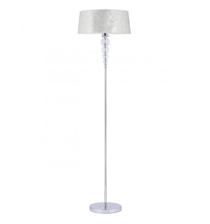 Lampara de pie Bernard Pie salón de la colección BERNARD. Fabricado en metal, acabado cromo, pantalla nácar, 4 bolas de metacrilato transparentes. 1 x E27 / 60WMax. Cable PVC negro de 1,8mts.