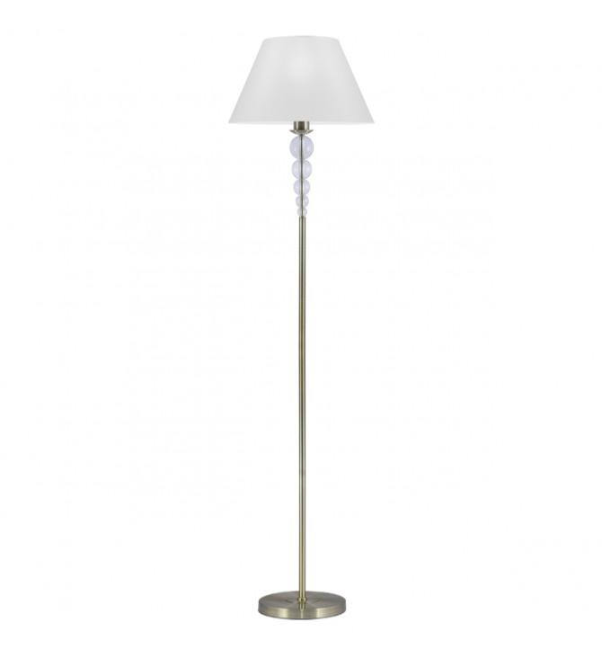 Lampara de pie Marela Pie salón de la colección MARELA. Fabricado en metal, acabado oro envejecido, pantalla tela blanca, 4 bolas de vidrio transparentes. 1 x E27 / 60WMax. Cable PVC negro de 1,8mts.
