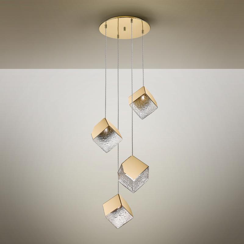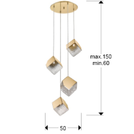 PRISCILA- LAMPARA 4L ORO - SCHULLERLámpara redonda de 4 luces, realizada en metal y acero acabado oro. Tulipa cúbica de cristal texturizado. Regulable en altura. Material/Tonalidad - Materiales: Metal, acero, cristal./Metal, - Acabado: Dorado, texturizado./Golden, t Iluminación - Número de Bombillas: 4 - Tipo de Bombillas: G9 - Bombillas incluidas: Sí - Potencia por Bombilla: 6W - Voltaje de Bombilla/s incluidas: 220 V - Potencia Eléctrica: 4x10W - Lúmenes: 2200 - Lúmenes por Bombilla: 550.0 - Tensión: 200/240 V - Frecuencia: 50 Hz - Frecuencia de Bombilla: 50 Hz Medidas - Articulo: Diámetro 50 cms / Alto 147 cms - Lámpara instalada: Altura Mínima 60 cms / Altura Máxima 150 cms - Peso: 5,9 Kg - Pantalla/Tulipa: Ancho 24 cms / Alto 24 cms / Fondo 22 cms - Florón de techo: Diámetro 32 cms / Alto 3 cms Otros Datos de Interés - IP: IP 20 - Tiempo aproximado de montaje: 10 Minutos - Código EAN: 8435435335441.0 - Colección: Priscila