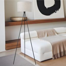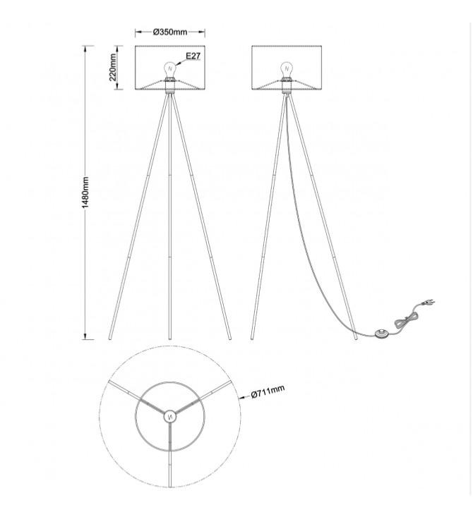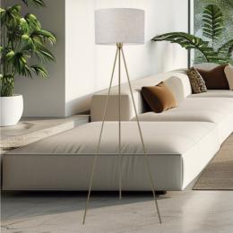 Pie de salón de la Colección TIVOLI, fabricado en metal con acabado en Nicquel satinado y pantalla de tela de lino.Espacio entre barras: 35 cm.Cable PVC negro con interruptor de pie, cae desde el portalámparas.