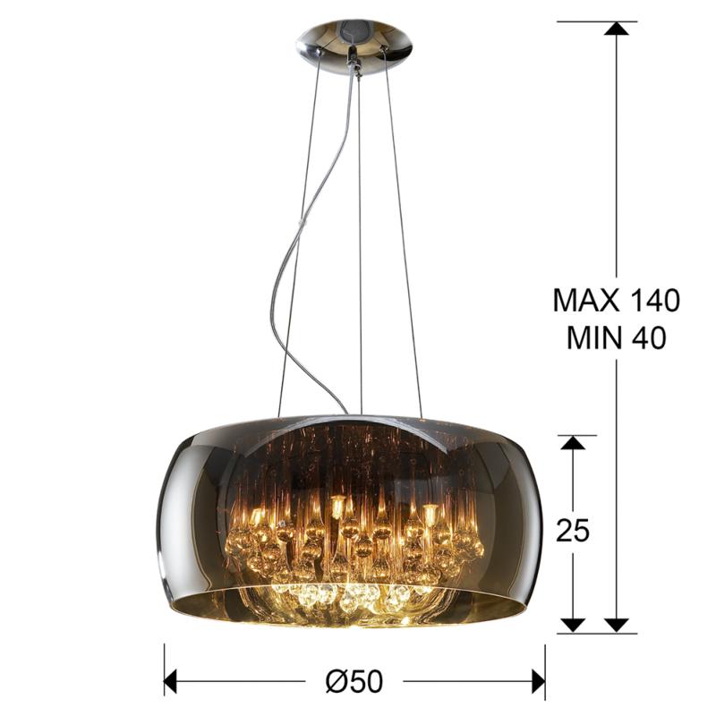 LAMPARA ·ARGOS· Ø50 - SCHULLERColgante realizado en metal acabado cromo. Tulipa de cristal espejado y lágrimas interiores de cristal tipo murano. Material/Tonalidad - Materiales: Metal y cristal/Metal and glas - Acabado: Cromo. Transparente y espejado - Tonalidad de Cable: Transparente Iluminación - Número de Bombillas: 6 - Tipo de Bombillas: G9 - Bombillas incluidas: Sí - Potencia por Bombilla: 6W - Voltaje de Bombilla/s incluidas: 220 V - Potencia Eléctrica: 6x10W - Lúmenes: 3300 - Lúmenes por Bombilla: 550.0 - Tensión: 220/240 V - Frecuencia: 50 Hz - Frecuencia de Bombilla: 50 Hz Medidas - Articulo: Diámetro 50 cms / Alto 25 cms - Lámpara instalada: Altura Mínima 40 cms / Altura Máxima 140 cms - Peso: 7,63 Kg - Pantalla/Tulipa: Diámetro 50 cms / Alto 22 cms - Florón de techo: Diámetro 18 cms / Alto 4 cms Otros Datos de Interés - IP: IP 20 - Tiempo aproximado de montaje: 20 Minutos - Código EAN: 8435435305208.0 - Colección: Argos