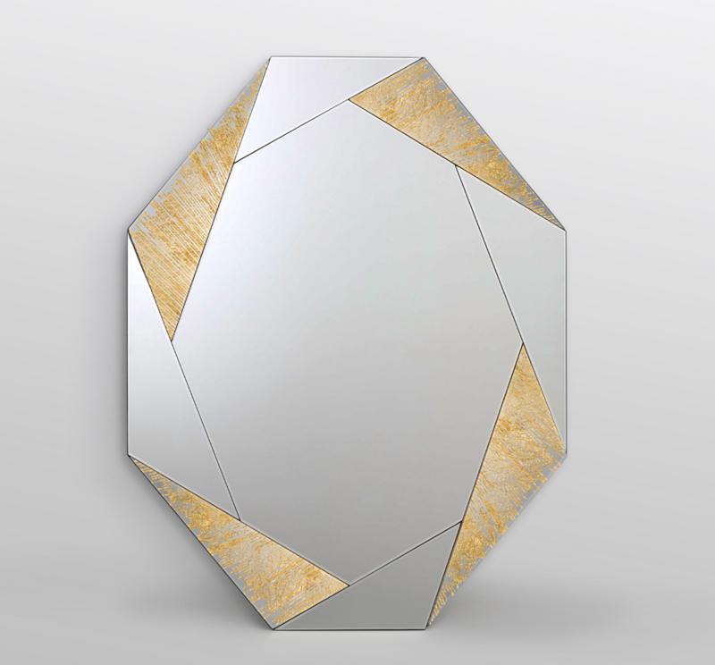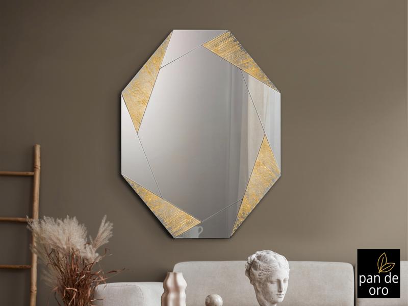 Espejo con lunas biseladas y grafismo en PAN DE ORO. Trasera de DM lacado en negro. Preparado para colgar en posición horizontal o vertical.