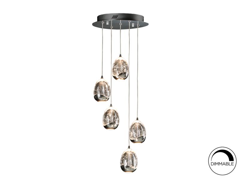 ROCIO LAMPARA 5L CROMO 30CM - SCHULLERLámpara de 5 luces LED. Realizada en metal acabado cromo. Tulipas con forma de gota realizadas en cristal macizo con burbujas decorativas en su interior. Regulables en altura. 25W LED. 2.400 lm. 3.000 K. Material/Tonalidad - Materiales: Metal y cristal/Metal and glas - Acabado: Cromo. Transparente./Chrome. C - Tonalidad de Cable: Transparente Iluminación - Potencia Eléctrica: 25W - Lúmenes: 2400 - Tonalidad de la luz: 3000 K - Tensión: 180/240 V - Frecuencia: 50/60 Hz - Vida Media: 50000 Horas Medidas - Articulo: Diámetro 30 cms / Alto 80 cms - Lámpara instalada: Altura Mínima 45 cms / Altura Máxima 150 cms - Peso: 5,75 Kg - Pantalla/Tulipa: Diámetro 9 cms / Alto 13 cms - Florón de techo: Diámetro 25 cms / Alto 5 cms Otros Datos de Interés - IP: IP 20 - Código EAN: 8435435310462.0 - Colección: Rocío