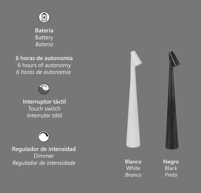 Sobremesa BELICE Alemar ARTICULO NO APTO PARA EXTERIORES. Sobremesa realizado en Acrilico con bateria de hasta 6 horas de autonomia. Su iluminacion LED incluye CCT para seleccionar entre luz fria, neutra o calidad, regulable en intensidad de luz. Encendido mediante interruptor tactil. Carga con cable UBS tipo C incluido en el sobremesa. Disponible en blanco y negro.