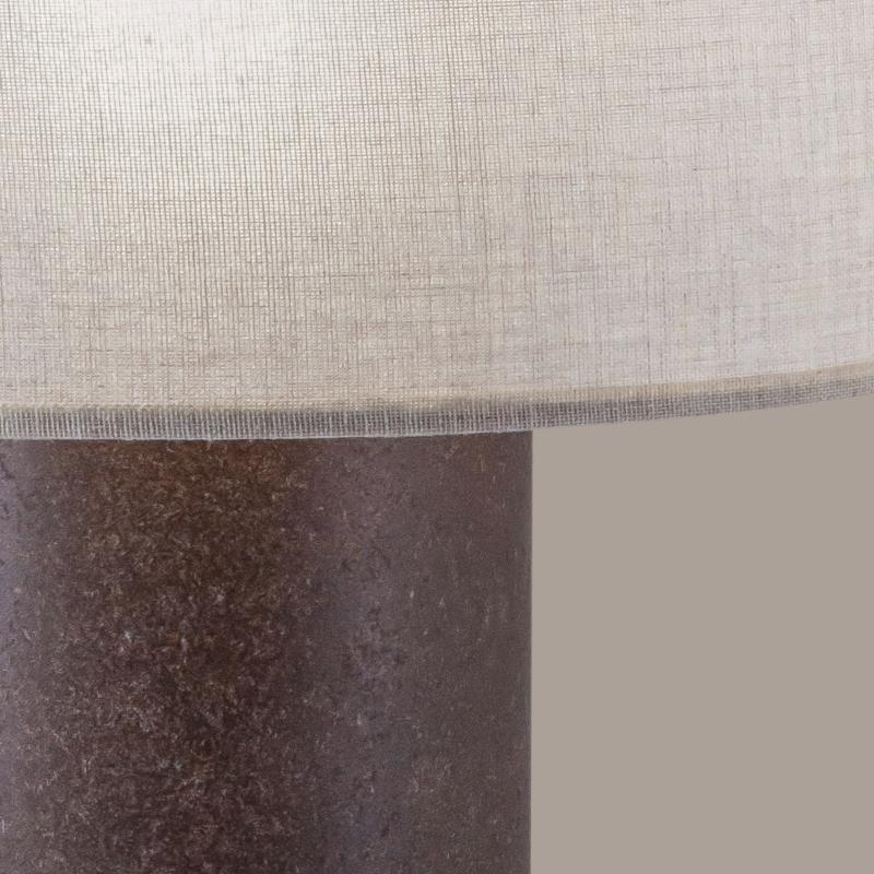 Sobremesa de la Colección BRANDY, de fabricación propia, elaborada con especial cuidado en los detalles, combinando metal negro y tela con un acabado artesanal. Pantalla de tela en acabado mármol de Ø30 cm.