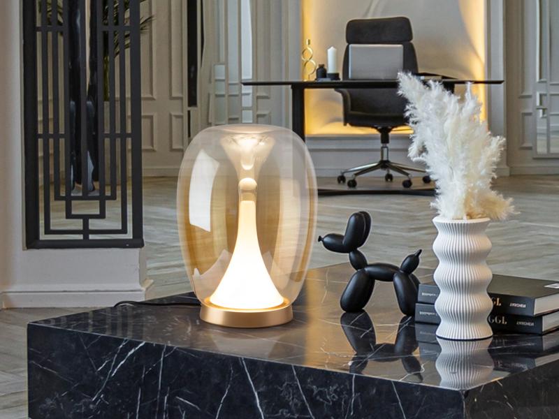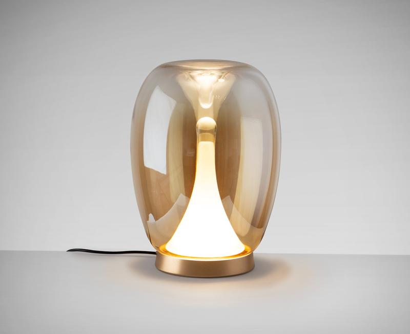 Lámpara de sobremesa realizada en aluminio dorado anodizado, con tulipa de cristal soplado acabado ambar degradado y difusor interior opal. 8,5W LED, 504 lm, 3.000 K.