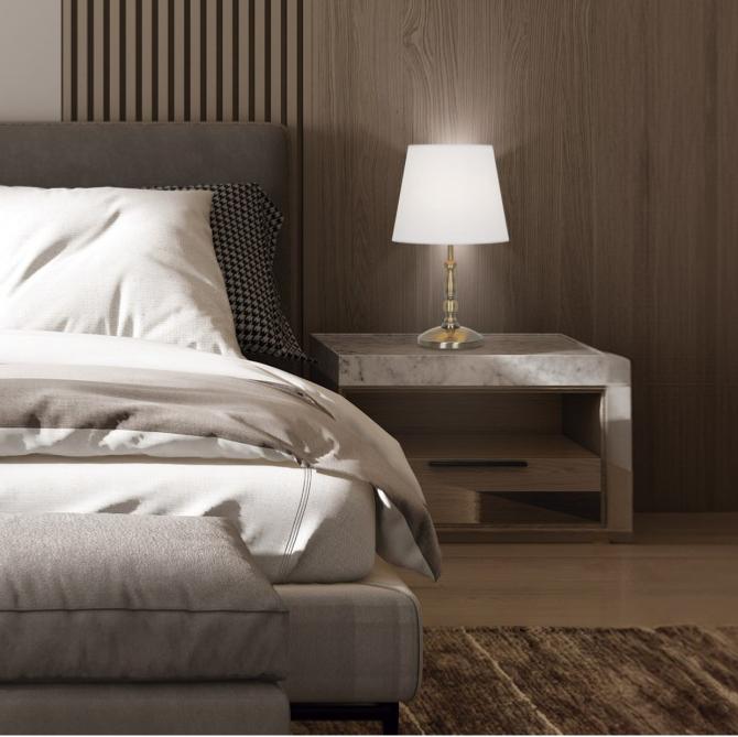 Sobremesa de la colección VERMUT, en acabado Latón y pantalla tela blanca. Usa bombilla E-27 compatilbles con bombillas LEd (no incluidas).Medidas Pantalla: Ø20cmCable PVC negro con interruptor ON/OFF en el cable.