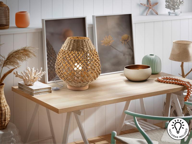 Lámpara de sobremesa pequeño de 1 luz, realizado en metal y madera, con pantalla de cuerdas de papel trenzado acabado beis.