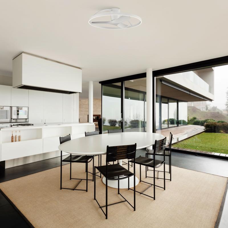 | Ventilador de Techo Nepal II Mantra | | Ventilador de techo con gran luminosidad equipado con aro exterior LED con 3 tonalidades de luz a seleccionar y graduar también en intensidad. Motor DC de bajo consumo de 6 velocidades. Todas las funciones del ventilador pueden graduarse desde el mando a distancia. | Caracteristicas Ventilador Nepal II Mantra | Materiales | - Base motor: Acrilico y metal - Aspas: Acrilicas | | Tonalidad de Metal | Blanco | Accionado mediante | Mando a distancia | Programador de apagado | Sí | Numero de Aspas | 3 | Tonalidad de Aspas | Blancas | Motor Tipo | DC - Corriente Continua | Velocidades | 6 | | Velocidades / Consumo | Sleep mode: 145 rpm - 3.5w - 2700 m3 - 32dB - 1ª velocidad: 145 rpm - 3.5w - 2700 m3 - 35.9dB - 2ª velocidad: 200 rpm - 7w - 3350 m3 - 37.9dB - 3ª velocidad: 2225 rpm - 9.5 w - 4200 m3 - 39.9dB - 4ª velocidad: 240 rpm - 12.5w - 4800 m3 - 41.6dB - 5ª velocidad: 285 rpm - 21.5w - 5400 m3 - 43.3dB - 6ª velocidad: 310 rpm - 32w - 6200 m3 - 45dB | | Flujo de Aire | 6200 m3 | Función Invierno | Sí. | Luz | Si - Luz LED 32w. | Datos de Luz | 2200 lúmenes - 2700-5000k - Luz Seleccionable | Luminaria Incluida | Si | Posible montaje en techo inclinado | No | Grafico de medidas Ventilador Nepal II Mantra |