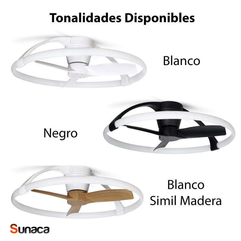 | Ventilador de Techo Nepal Mini Mantra | | Ventilador de techo con gran luminosidad equipado con aro exterior LED con 3 tonalidades de luz a seleccionar y graduar también en intensidad. Motor DC de bajo consumo de 8 velocidades. Todas las funciones del ventilador pueden graduarse desde el mando a distancia, también desde aplicación instalada en cualquier dispositivo con Bluetooh o con la voz a traves de Google home o Alexa. | Caracteristicas Ventilador Nepal Mantra | Materiales | - Base motor: Acrilico y metal - Aspas: Acrilicas | | Tonalidad de Metal | Blanco | Accionado mediante | Mando a distancia | Programador de apagado | Sí | Numero de Aspas | 3 | Tonalidad de Aspas | Blancas | Motor Tipo | DC - Corriente Continua | Velocidades | 8+1 | Velocidades / Consumo Flujo de aire (m3/hora) / Nivel Sonoro | - Sleep Mode: 100 rpm - 3.5w - 1050 - 33dB - 1ª velocidad: 150 rpm - 5w - 1470 - 35.9dB - 2ª velocidad: 185 rpm - 6w - 1760 - 37.9dB - 3ª velocidad: 220 rpm - 7.5w - 2115 - 39.9dB - 4ª velocidad: 250 rpm - 10w - 2760 - 41.6dB - 5ª velocidad: 280 rpm - 13w - 3510 - 43.3dB - 6ª velocidad: 310 rpm - 18w - 4535 - 45dB - 7ª velocidad: 350 rpm - 24w - 5325 - 47.2dB - 8ª velocidad: 380 rpm - 30w - 5760 - 49dB | | Flujo de Aire | 5760 m3 | Función Invierno | Sí. | Luz | Si - Luz LED 55w. | Datos de Luz | 7200 lúmenes - 2700-5000k - Luz Seleccionable | Luminaria Incluida | Si | Posible montaje en techo inclinado | No | Grafico de medidas Ventilador Nepal mini Mantra |