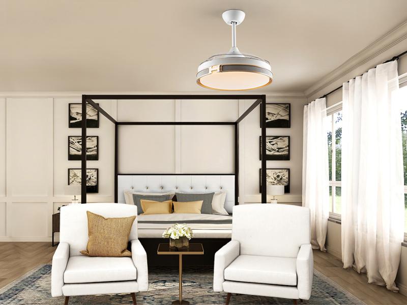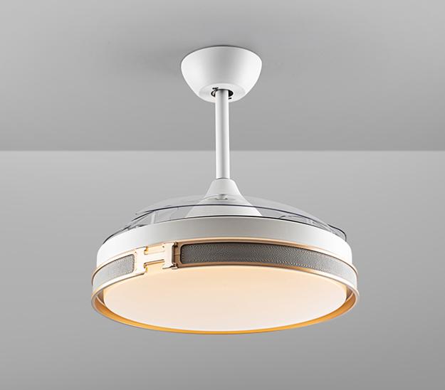 Ventilador de techo con luz LED CCT, realizado en metal acabado blanco mate. Aro decorativo en dorado y polipiel gris. Difusor opal y aspas escamoteables transparentes. Motor DC de 6 velocidades e inversión, 3 temperaturas de color, Temporizador.