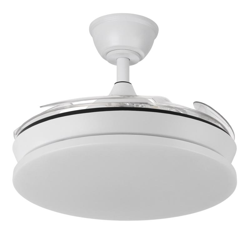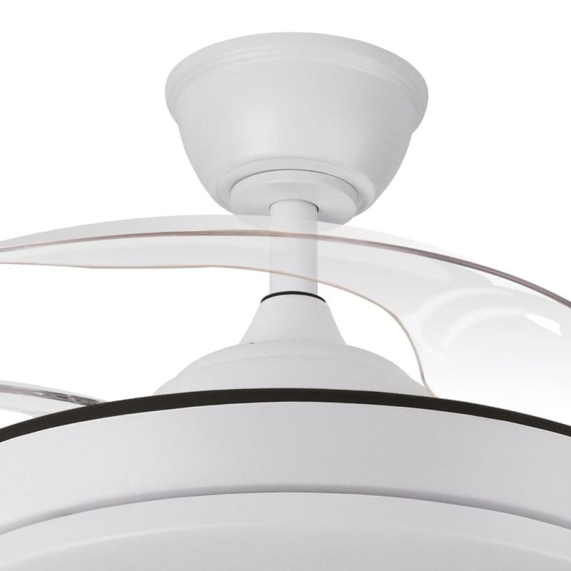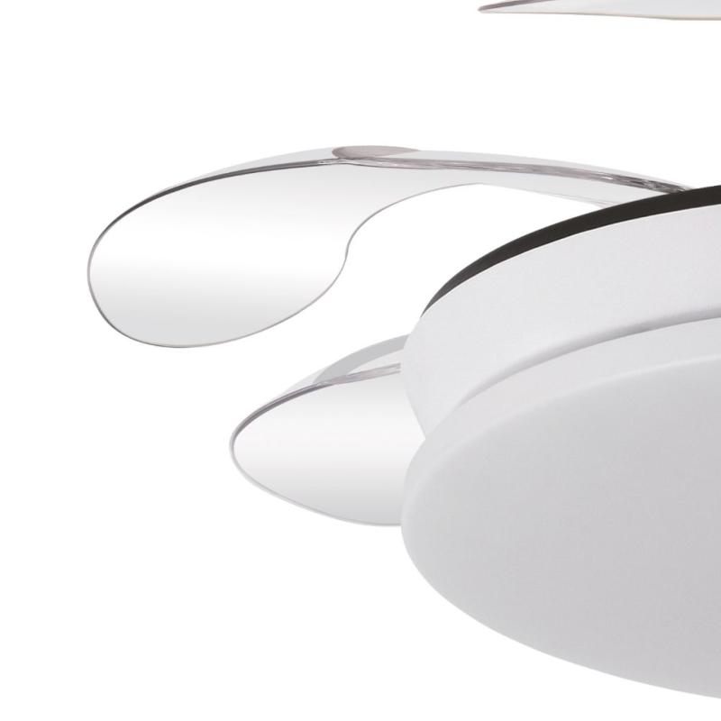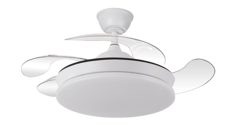 | Ventilador de Techo Tridente Mini Fabrilamp | Ventilador DC de la serie TRIDENTE MINI realizado en metal, policarbonato y ABS, en color BLANCO con cuatro aspas DESPLEGABLES de ABS transparente muy resistentes. De diseño innovador, ideal para completar tanto en decoraciones modernas como clásicas, realizando tanto la función de lámpara como de ventilador. Motor DC con seis velocidades ajustables. Tecnología LED integrada con una potencia de 59W, 6980 lúmenes y 3 TEMPERATURAS SELECCIONABLES DE LUZ (3000-4000-6000K) luz cálida, natural y blanco frío. Es REGULABLE EN INTENSIDAD, con mando a distancia INCLUIDO con MEMORIA DE COLOR incorporada y TEMPORIZADOR 2/4 H. Control de aire verano o invierno. Su medida es de 34,5/42X40 centímetros con las aspas plegadas y de 34,5/42X91 centímetros con las aspas desplegadas. Incluye dos tijas de 12,5 y 20 centímetros, para colocar a distintas alturas. Encontramos en esta serie dos tamaños de ventiladores y en los colores blanco, negro, níquel y cuero, para elegir el más le guste y el que mejor se adapte a su decoración.. | Características Ventilador Tridente Mini Fabrilamp | Materiales | - Base Motor: Metal - Aspas: Acrílicas - Difusor inferior: Policarbonato y metal | | Tonalidad de Metal | Blanco | Accionado mediante | Mando a distancia. | Programador de apagado | Sí. 1, 2, y 4 horas. | Numero de Aspas | 4 | Tonalidad de Aspas | Transparentes | Motor Tipo | DC - Bajo Consumo | Velocidades | 6 | Consumo / Flujo aire Revoluciones / Sonoridad | - 1ª velocidad: 7w - 2702 m3 - 170 rpm - 34.3 dB - 2ª velocidad: 12w - 3458 m3 - 190 rpm - 35.1 dB - 3ª velocidad: 17w - 46561 m3 - 210 rpm - 35.9 dB - 4ª velocidad: 22w - 5518 m3- 230 rpm - 37.2 dB - 5ª velocidad: 27w - 6370 m3 - 250 rpm - 38.3 dB - 6ª velocidad: 32w - 7166 m3 - 270 rpm - 40 dB | Función Invierno | Sí | Luz | Si - Luz LED de 59w. | Datos de Luz | 6980 lúmenes | | Tonalidad de la Luz | Seleccionable (3000-4000-6000k) Regulable en intensidad. | Posible montaje sin Barra | No | Posible montaje en techo inclinado | Sí* | Grafico de medidas Ventilador Tridente Mini Fabrilamp |